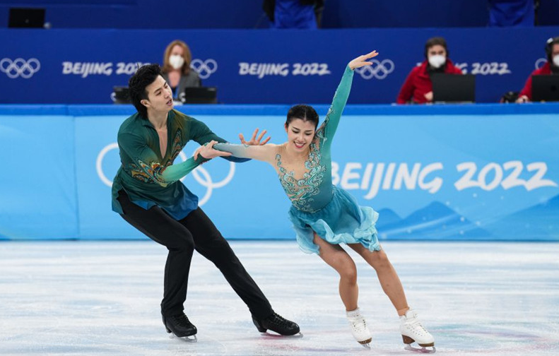 2月7日,王诗玥/柳鑫宇身着设计灵感取自《千里江山图》的中国元素比赛服,在花滑团体赛冰舞自由舞的比赛中以一曲《功夫钢琴》演绎出中国古典山水画的绵长意境与中国功夫的刚柔并济。滑行优美流畅,情感充沛饱满。“我们希望在冬奥会的舞台展现中国文化,让全世界都能看到中国风。”王诗玥说。“冬奥会在北京举办,就像我们在家请客吃饭,客人来了,肯定要做一些中国菜。”柳鑫宇补充道。